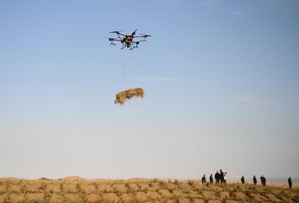 在阿拉善左旗“三北”六期工程蒙甘边境防沙治沙沙漠锁边项目现场,200多名治沙工人俯身沙海,将一株株花棒苗植入沙土中。“我们运用无人机苗木调运技术,以智能化手段替代人力,大幅提升种植效率与精准度,为造林工作注入科技动能。”内蒙古阿拉善左旗蓝马园林生态建设有限责任公司副总经理刘海军说。