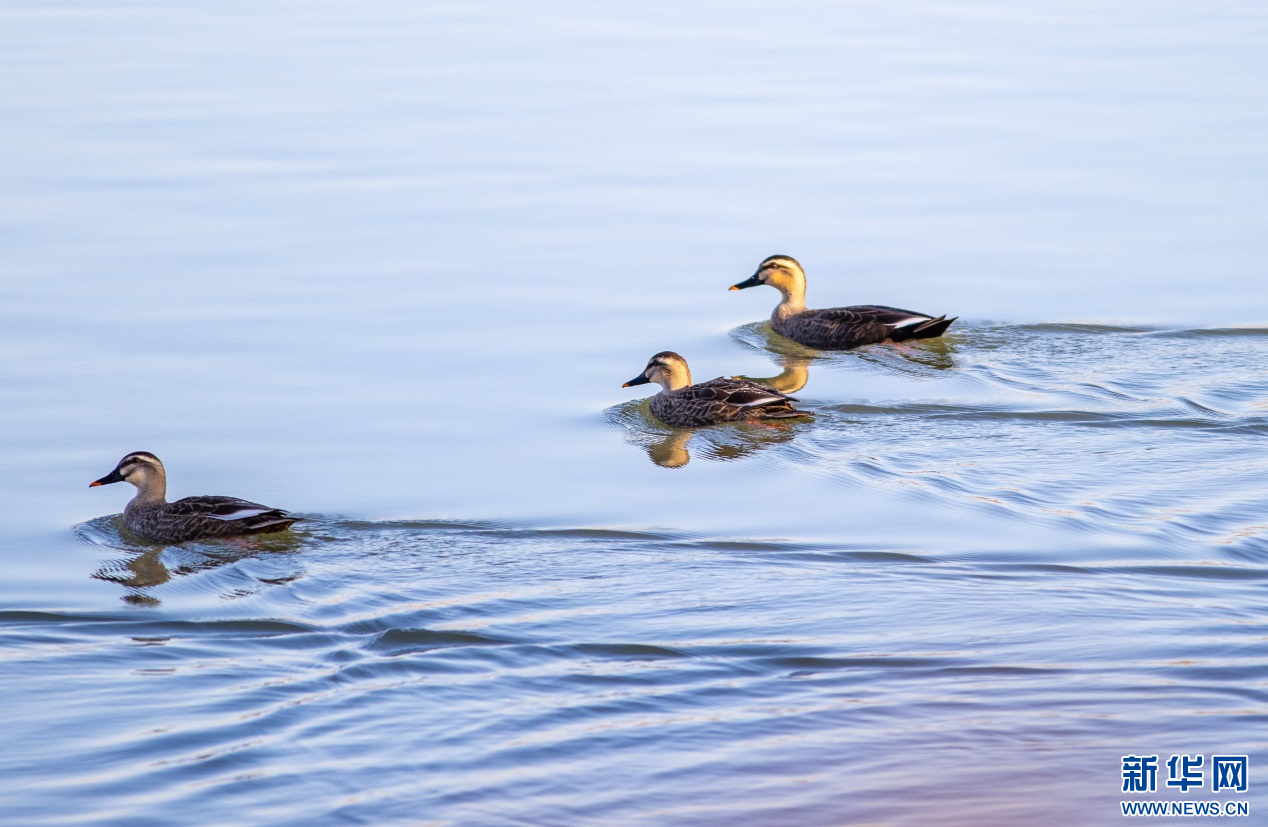 11月19日,斑嘴鸭在呼和浩特市玉泉区“千岛湖”景区的水面上栖息、觅食。新华网发(丁根厚 摄)
