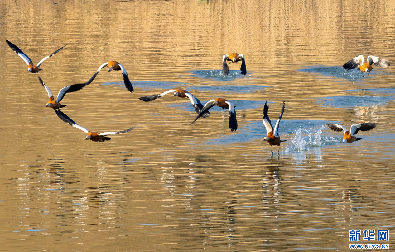 11月19日,赤麻鸭在呼和浩特市玉泉区“千岛湖”景区的水面上空飞翔。新华网发(丁根厚 摄)