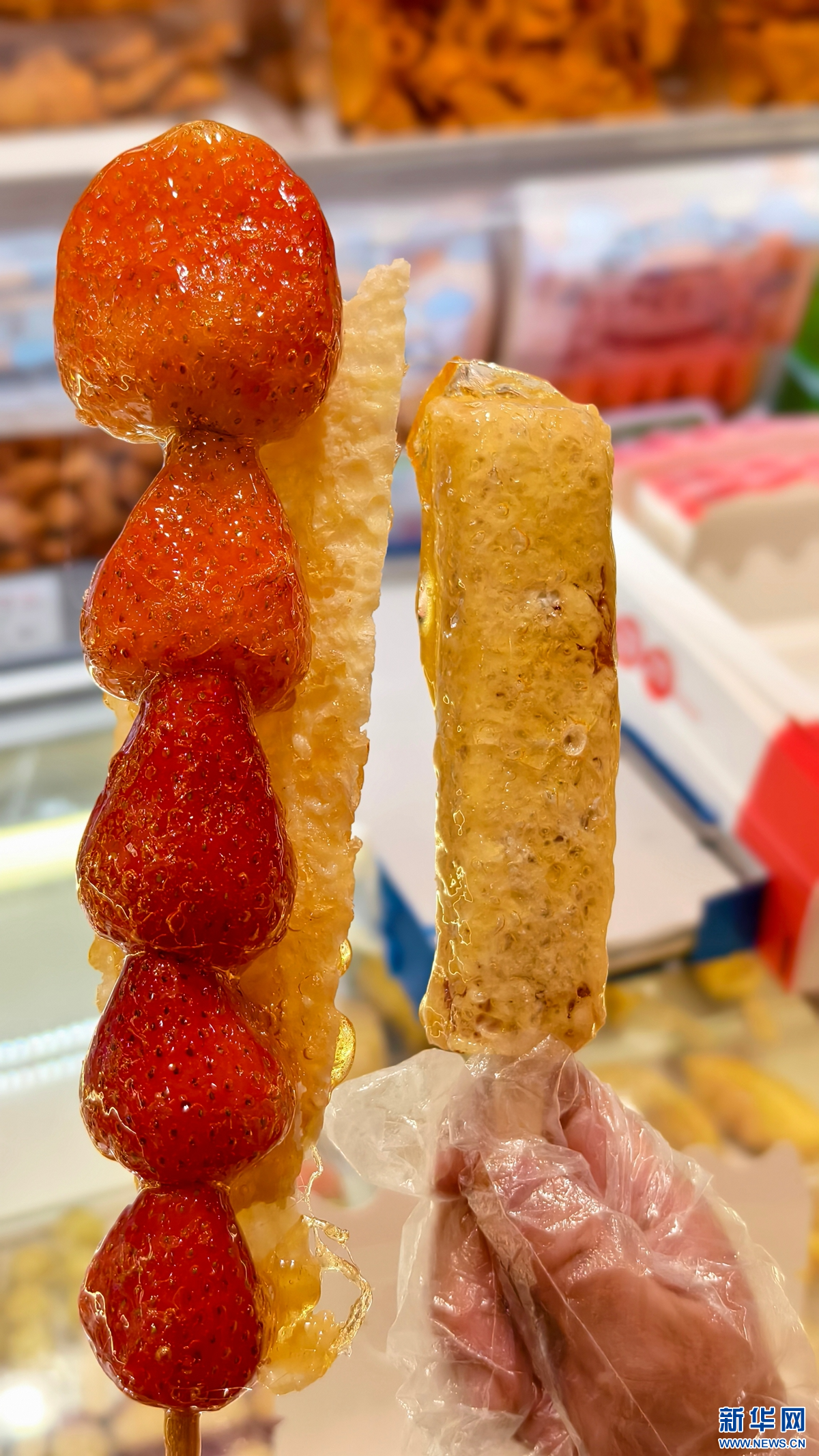 市场上销售的奶皮子草莓糖葫芦和奶皮子山楂糕。新华网 杨腾格尔摄