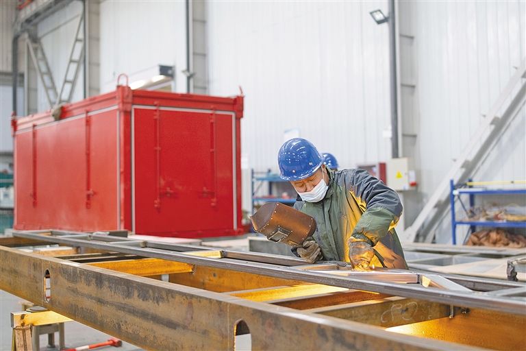 工人焊接太空舱钢架。