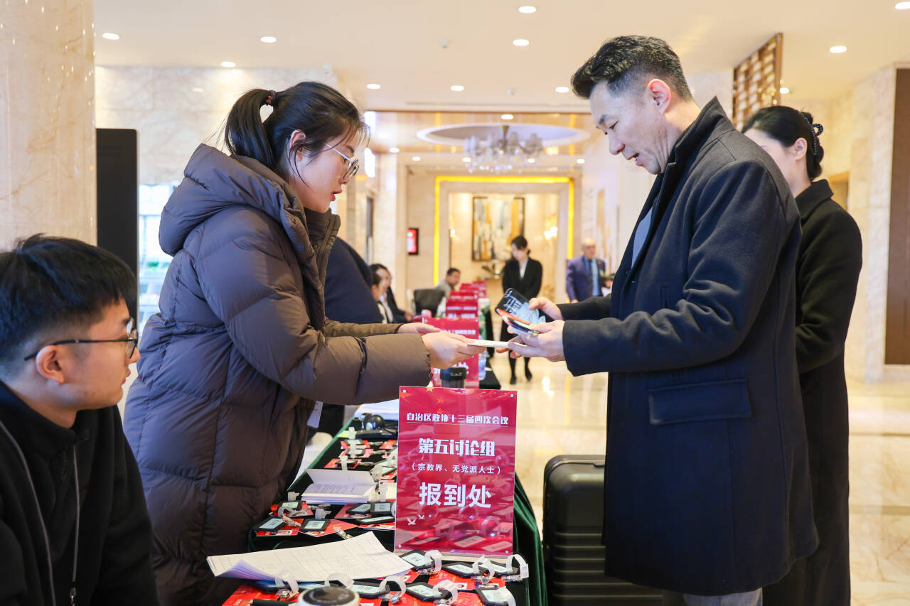 出席自治区政协十三届四次会议的政协委员(右)领取会议材料。