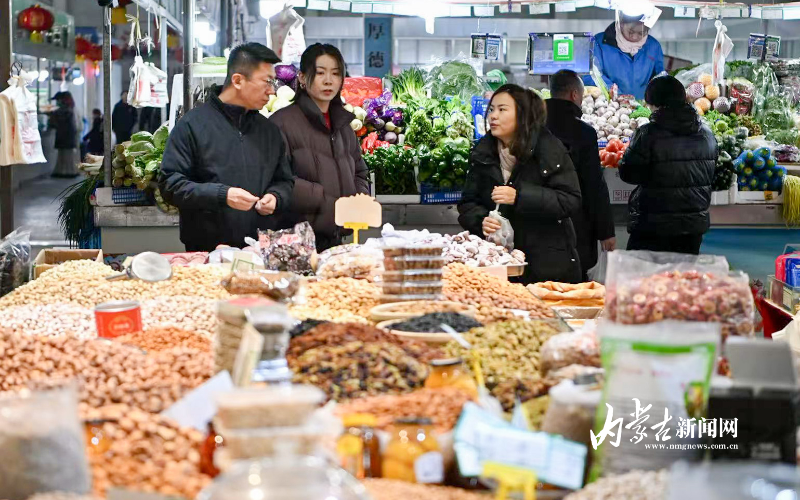 2月1日,呼和浩特市民在保全庄农贸市场内选购水果。当日,呼和浩特市商场超市、集贸市场内人头攒动,热闹非凡,市民们正忙着选购各类年货,迎接马年春节。随着春节临近,内蒙古各地消费市场迎来了旺季,重点商超、集贸市场纷纷加大商品的采购和储备力度,目前货源充足,品种丰富,确保春节前商品供应不断档。摄影/草原云·内蒙古新闻网首席记者 牛天甲