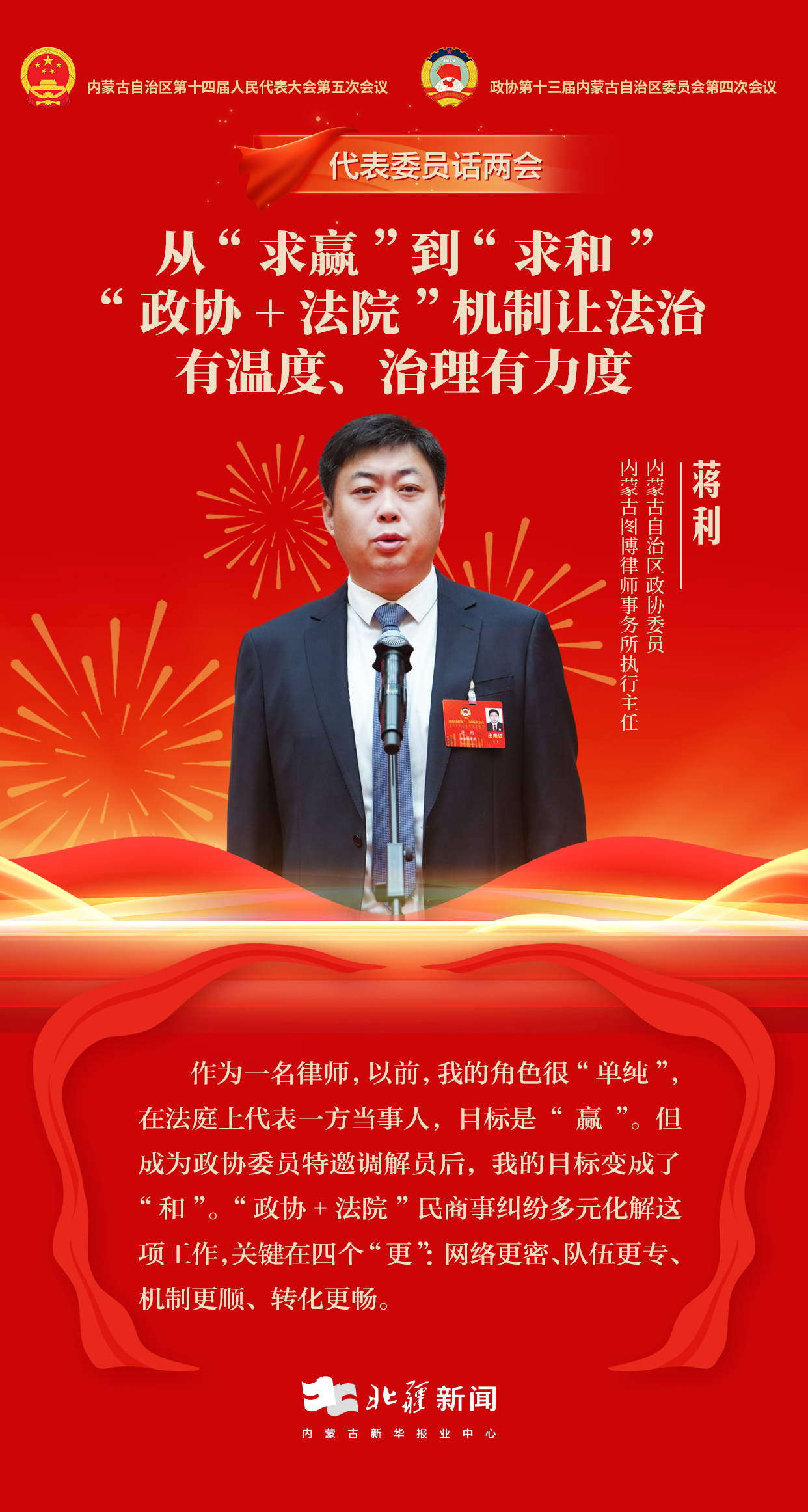 “作为一名律师,以前,我的角色很‘单纯’,在法庭上代表一方当事人,目标是‘赢’。但成为政协委员特邀调解员后,我的目标变成了‘和’。”自治区政协委员、内蒙古图博律师事务所执行主任蒋利说。