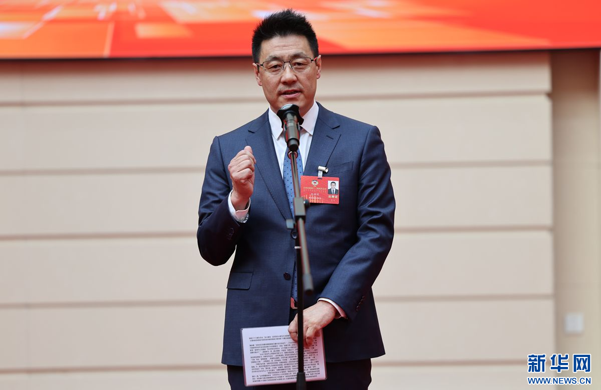 2月4日下午,在内蒙古自治区政协十三届四次会议第二场“委员通道”上,自治区政协委员、内蒙古奇略信息技术有限公司董事长岳耀明接受采访。新华网 杨腾格尔摄
