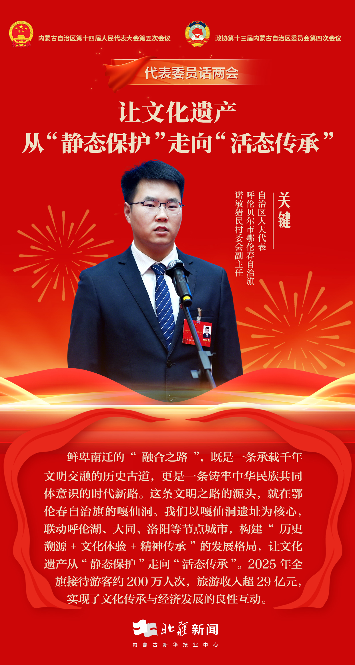 “‘融合之路’既是一条承载千年文明交融的历史古道,更是一条铸牢中华民族共同体意识的时代新路。”2月4日,内蒙古自治区第十四届人民代表大会第五次会议“代表通道”上,自治区人大代表、呼伦贝尔市鄂伦春自治旗诺敏猎民村村委会副主任关键,从铸牢中华民族共同体意识的角度,详解了以拓跋鲜卑南迁历史为脉络的“融合之路”,分享了鄂伦春自治旗作为“融合之路”起点的传承与发展实践。
