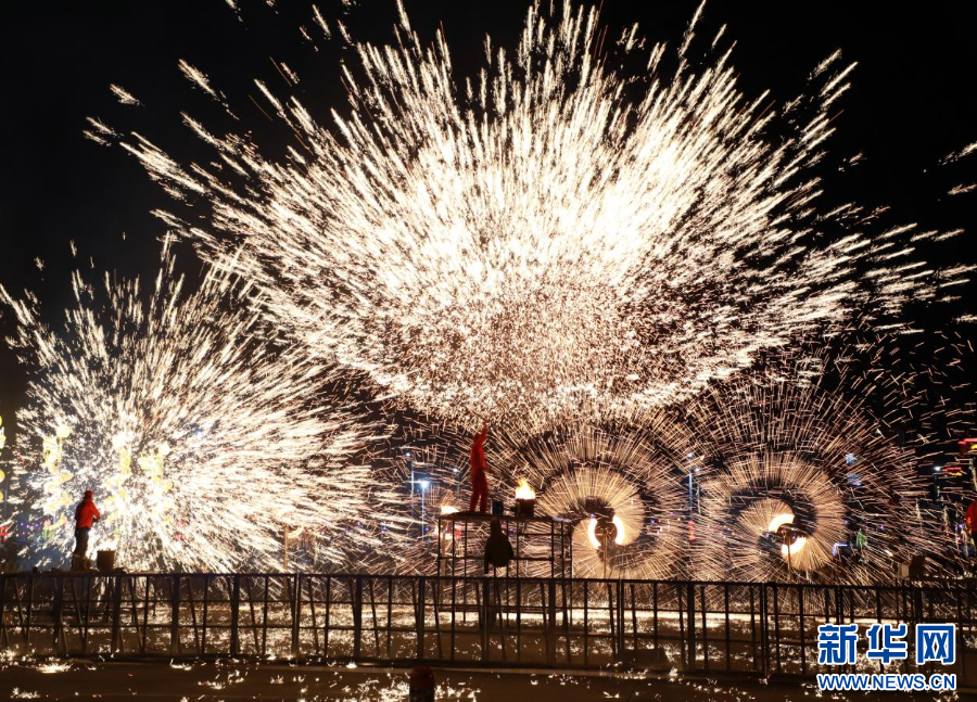 乌兰察布之夜街区内的打铁花表演。新华网发