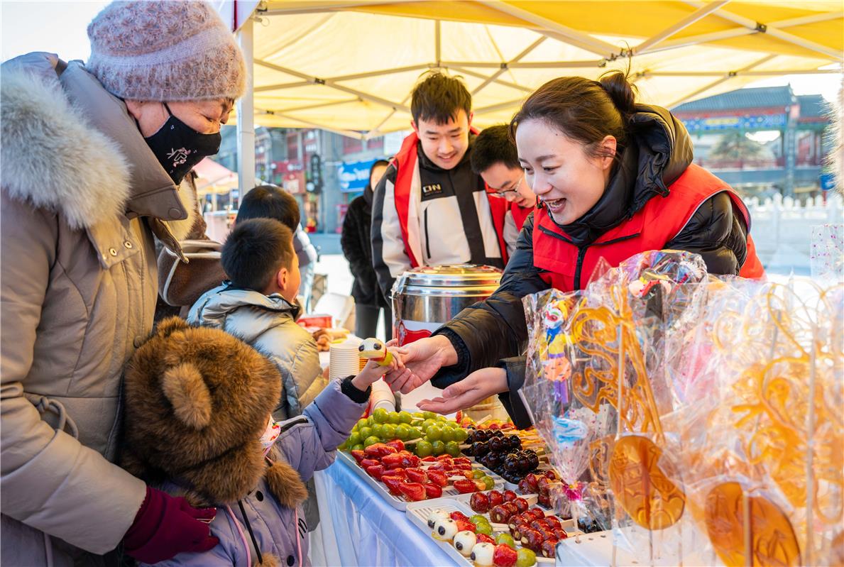 志愿者为小朋友免费发放糖葫芦。