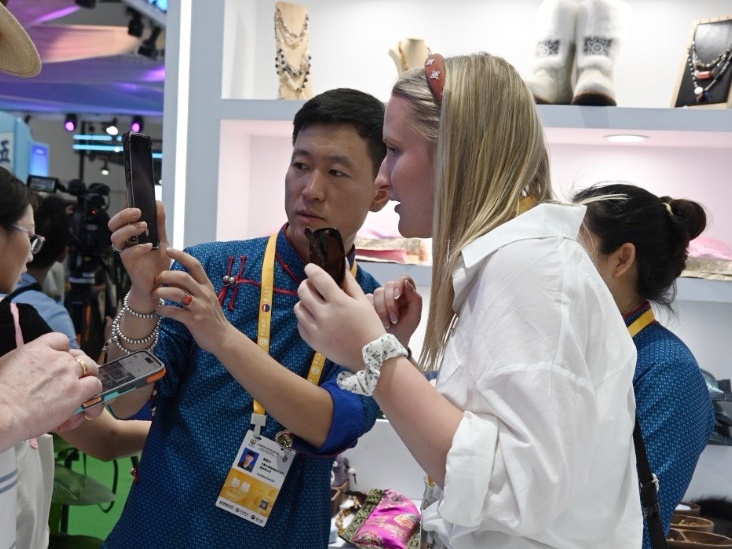 “本届消博会,内蒙古展区设计深度融合消博会‘开放引领全球消费,创新驱动美好生活’的主题,让内蒙古优势特色产品成为主角,通过精巧的陈列与沉浸式的体验,让观众在触摸、品鉴、互动中,自然而然地感受内蒙古的资源优势、产业特色和对外开放新格局。”内蒙古自治区商务厅外贸处相关负责人介绍,此次参展,内蒙古展区展品涉及食品、纺织、养生保健、农畜产品、民族手工艺品等五大类。