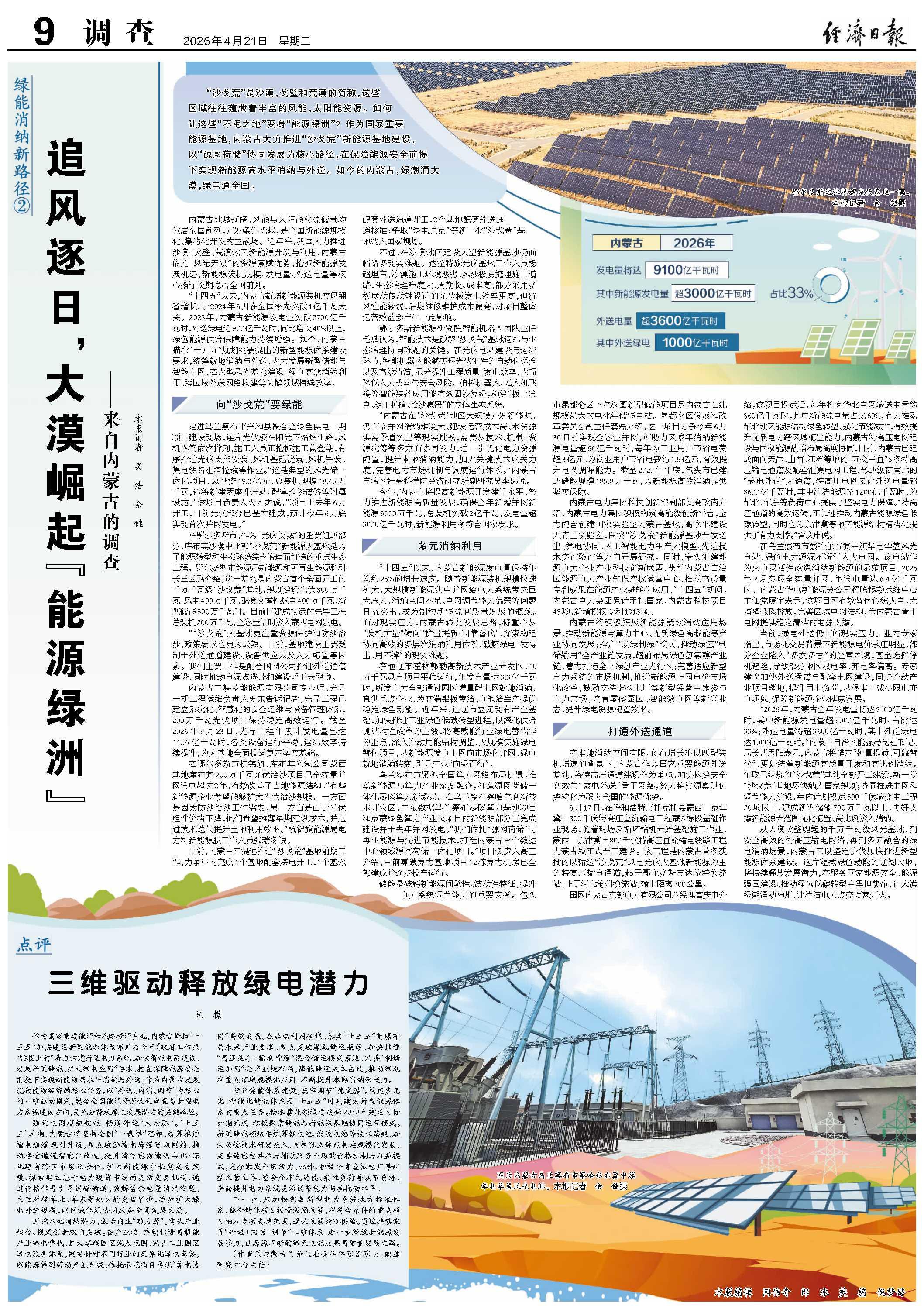 “沙戈荒”是沙漠、戈壁和荒漠的简称,这些区域往往蕴藏着丰富的风能、太阳能资源。如何让这些“不毛之地”变身“能源绿洲”?作为国家重要能源基地,内蒙古大力推进“沙戈荒”新能源基地建设,以“源网荷储”协同发展为核心路径,在保障能源安全前提下实现新能源高水平消纳与外送。如今的内蒙古,绿潮涌大漠,绿电通全国。