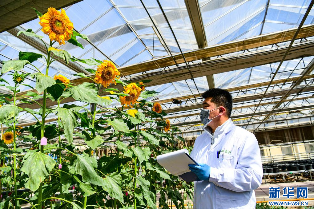 4月10日,在位于巴彦淖尔市五原县的三瑞农科向日葵科学院,工作人员正在温室大棚内监测实验向日葵的长势。新华网发(康文魁 摄)
