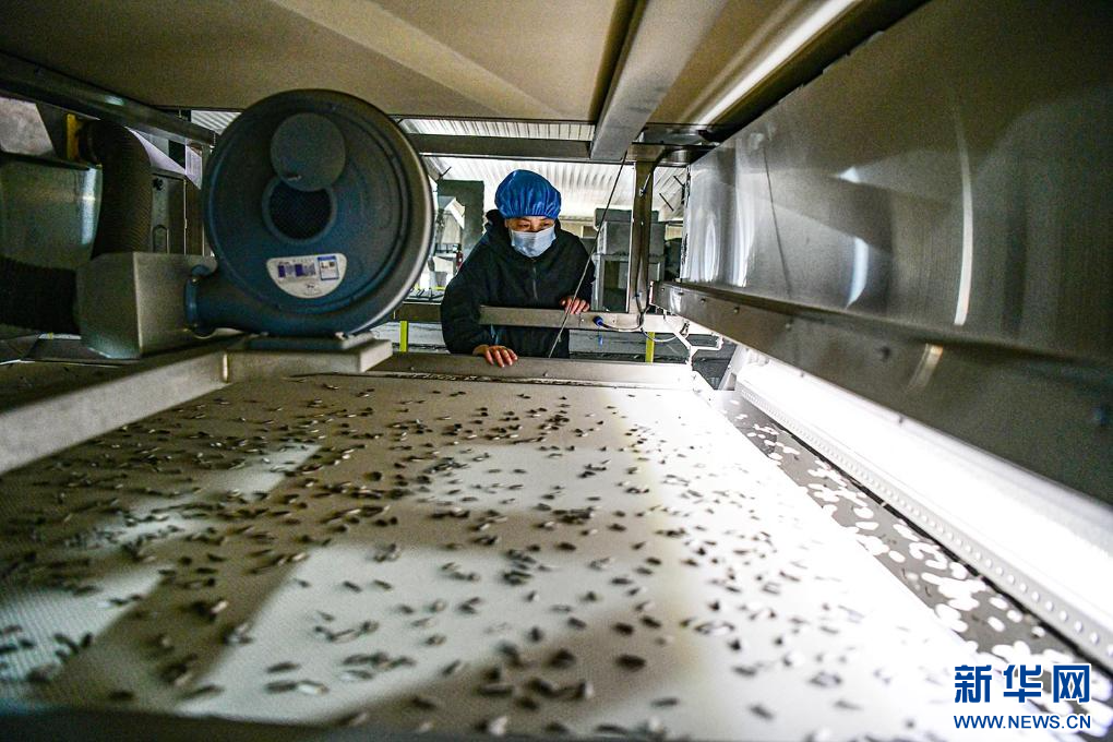 4月10日,在五原县民泰农贸有限责任公司,员工在葵花籽色选机旁工作。新华网发(康文魁 摄)